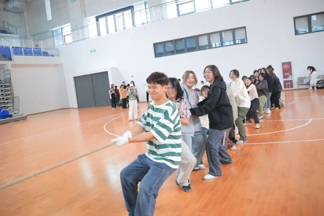 本次新生趣味运动会共设置了花毽围踢、旋风跑、同心鼓、竞速毛毛虫、拔河、同舟共济六大兼具趣味性和挑战性的比赛项目,充分照顾到了同学们多样化的运动需求,让同学们在锻炼身体、享受运动的同时锻炼团队合作的意愿和能力。具体来说,“花毽围踢”和“旋风跑”两个项目展现了同学们非凡的团队协作能力与策略规划;“同心鼓”与“竞速毛毛虫”两大项目,则是智慧与协作的最佳试炼场;“拔河”环节无疑是力量的直接碰撞,赛场上的呐喊,汇聚成一首首激昂的战歌,两军对垒,势均力敌,每一次拉锯都见证着意志的坚韧;“同舟共济”是对团队默契考验的绝佳契机,口号整齐划一,步履坚定如一。