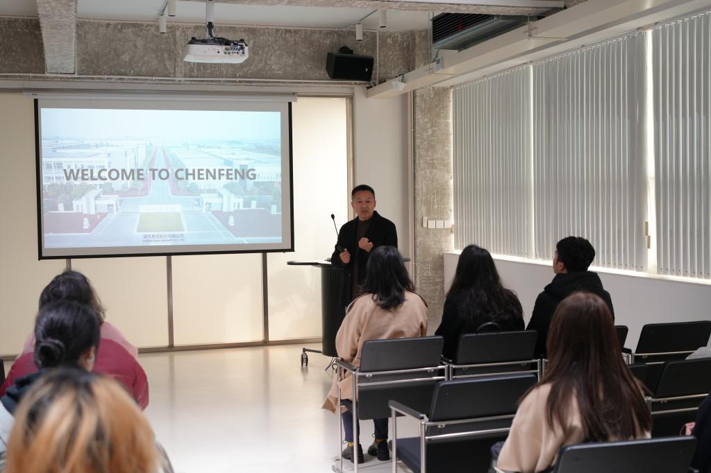 晨风时尚创意产业园副总经理、办公室主任张霄鹏热情接待学院一行,并从公司背景、核心业务、品牌形象、配套服务等方面进行介绍。他表示晨风集团始终将人才培育置于战略高地,已与多所国内服装专业顶尖高校构建了长效合作机制,在实践中打磨出一套成熟的专业人才培养模式,沉淀了丰富的经验与成果。晨风集团表达了与学院深化合作的强烈意愿,期待双方携手锻造更多兼具扎实专业素质与创新实践能力的复合型人才,为服装行业的创新发展注入新动能。