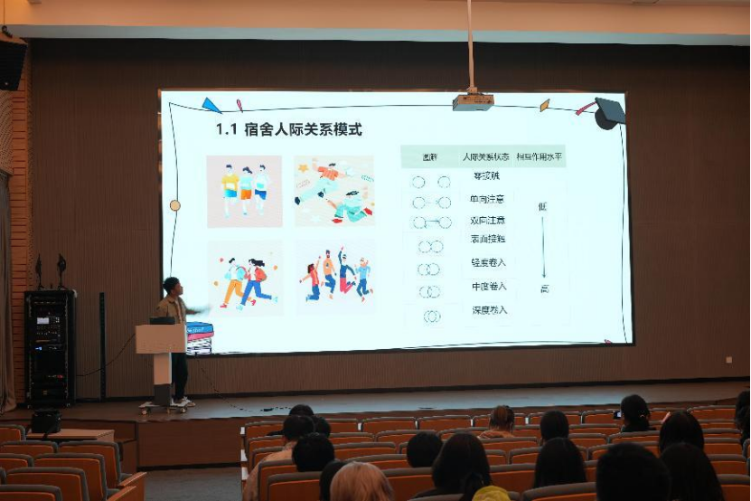 随后,冯老师以深入浅出的方式,从“小家长与大作为:如何打造和谐宿舍?”“小细节与大温暖:哪些同学需要关心?”“小举动与大帮助:怎么关心宿舍同学?”三个维度为宿舍长构建了一套职责明确、操作性强的工作框架,详细阐述了宿舍长在日常生活中应如何发挥引领作用,以促进宿舍成员间的相互理解和支持。