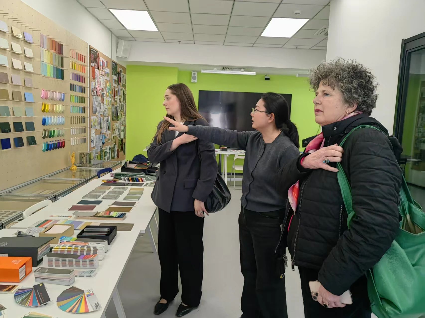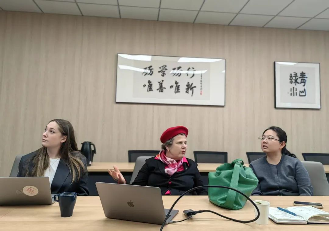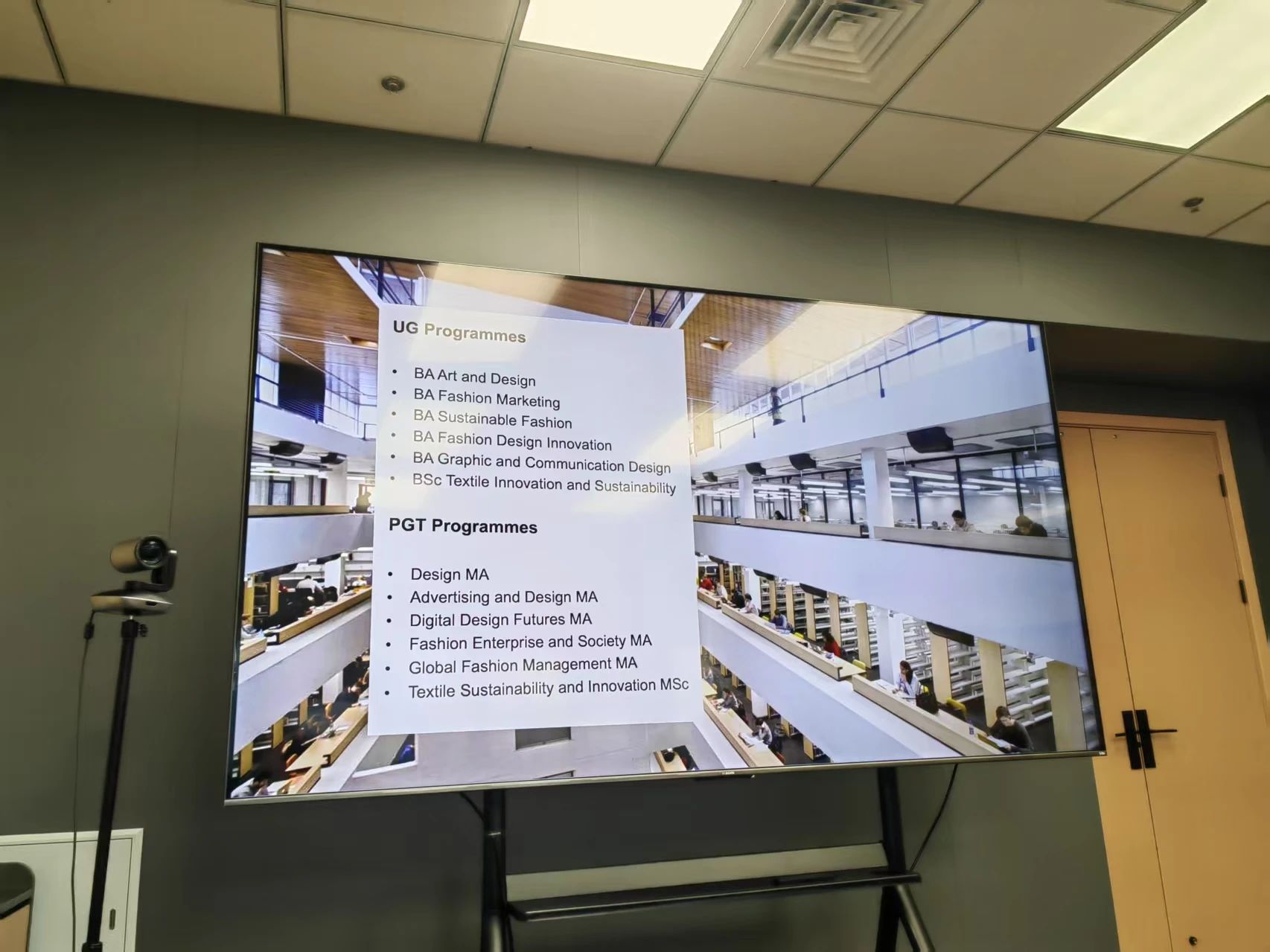 交流过程中,Andrea Thoma女士介绍了利兹大学设计学院在交互设计、数字设计未来、可持续时尚等方向的布局与发展情况,表示其课程所注重的跨学科实践与行业前沿技术结合导向(例如数字设计未来硕士课程涵盖VR/AR、AI与用户体验设计等内容),与江南大学数创学院方向高度契合。Hannah Mawson女士介绍,利兹大学设计学院近年来积极推动产学研的转化,例如与阿卡迪亚集团等企业合作研发智能纺织技术,并与欧洲多国高校共建了虚拟实验室,学院拥有行业级设施,包括3D打印中心、智能面料实验室及跨学科研究团队。