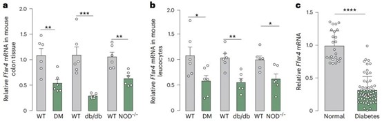 图2:糖尿病患者和糖尿病小鼠Ffar4表达水平显著降低