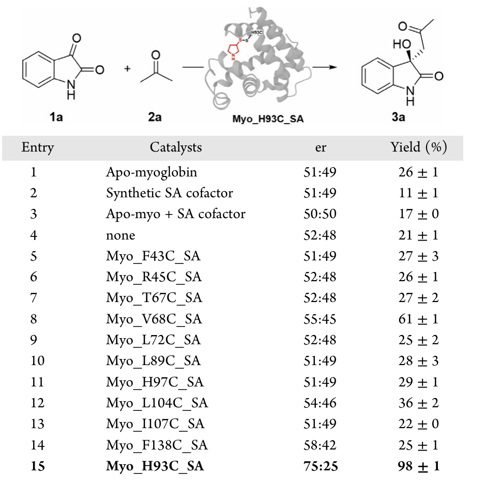 作者选择了丙酮与吲哚醌的缩醛反应作为本研究的模型反应。经共价酶库筛选,大部分人工酶显示出可检测的对映选择性和催化活性,其中,Apo-Myo_H93C_SA显示出最高的反应活性和手性,比例为75:25,产率高达98%。对照实验显示,未共价的Apo-Myo_H93C蛋白、单独的辅因子,以及Apo-Myo与辅因子的组合仅产生了适度的背景产率,但没有任何对映体选择性。