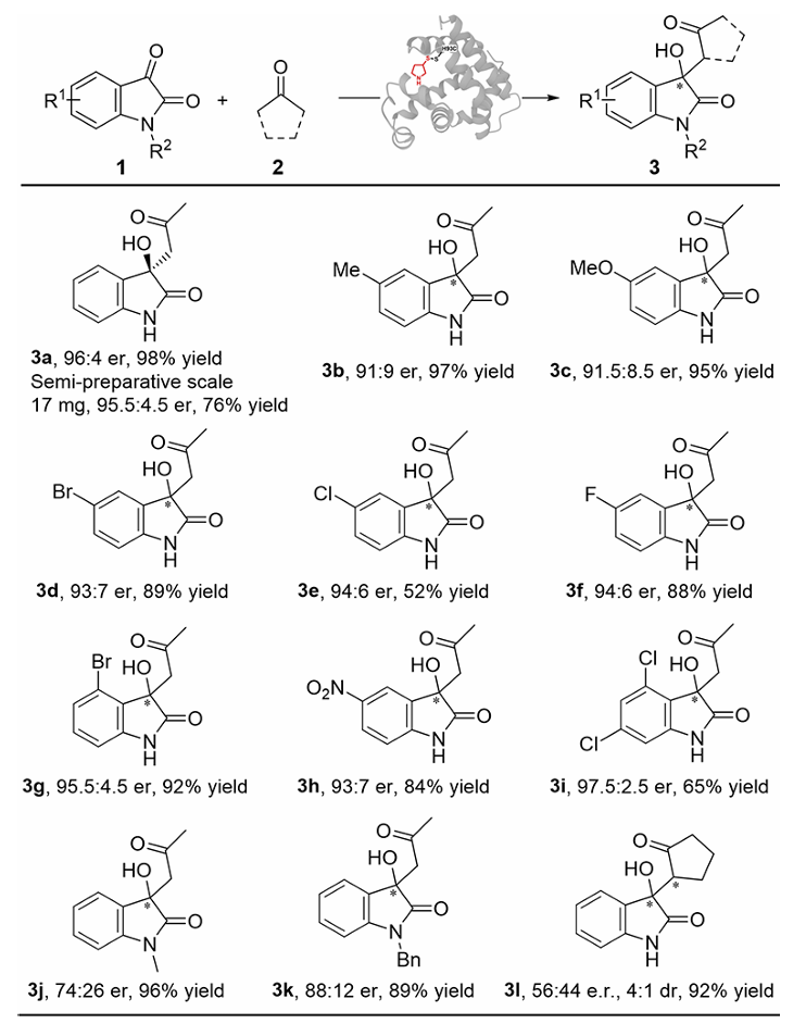 3-羟基氧化吲哚类骨架广泛存在于天然产物中,此类化合物通常表现出显著的生物活性。这些分子中C3立体中心的绝对构型对受体结合、代谢稳定性和下游生物效应有深远影响,因此3-羟基氧化吲哚化合物的立体选择合成是一个持久的合成挑战,而目前此类化合物的生物合成报道相对较少。