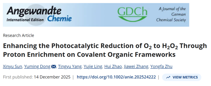 近日,我校化学与材料工程学院董玉明教授在光合成双氧水领域取得突破性进展,研究成果以“Enhancing the Photocatalytic Reduction of O2 to H2O2 Through Proton Enrichment on Covalent Organic Frameworks”为题发表在《Angewandte Chemie International Edition》上。论文第一作者为博士研究生孙新宇,通讯作者为董玉明教授。